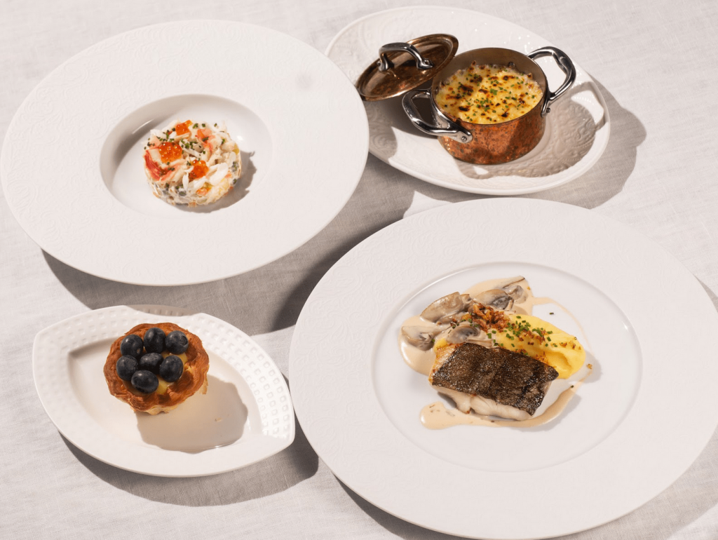 Гурманский сет во французском стиле – салат «Маседуан» с камчатским крабом, жульен с цесаркой, палтус с воздушным картофельным пюре и грибным соусом и нежный флан со свежими ягодами в финале.