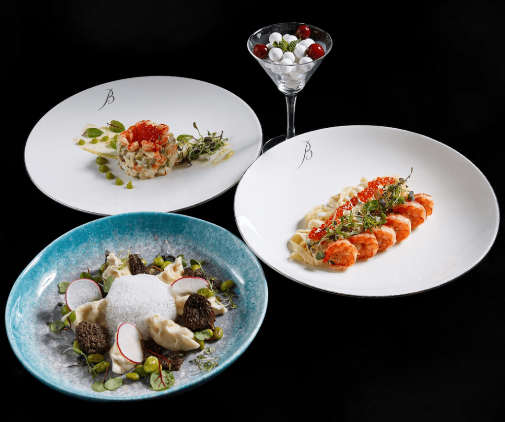 Наш сет – современный взгляд на русскую кухню. Оливье «Балчуг» с раковыми шейками, нежные вареники с сулугуни и сморчками в сливочном соусе, паста «Аляска» с дальневосточными креветками и красной икрой. Идеальный финал – десерт «Снежки», хрустящая клюква в сладкой пудре.