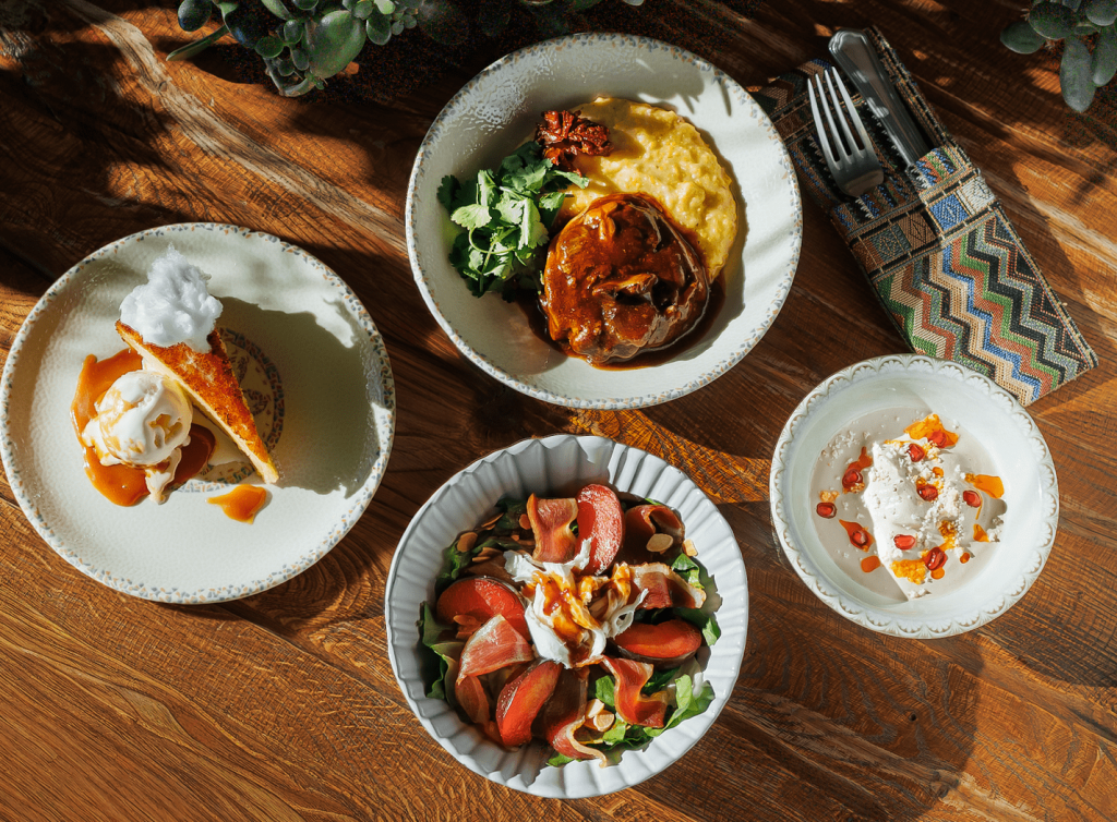 В своем сете я презентую четыре блюда. Холодная закуска сациви из индейки, салат с вяленой уткой, шея ягненка конфи с кукурузной кашей с сулугуни. Завершает сет местный специалитет – шарлотка с яблоками и грушей, обжаренных на сливочном масле, с добавлением белого сухого вина, корицы, бадьяна, тимьяна и меда, в тесто добавляется мацони.