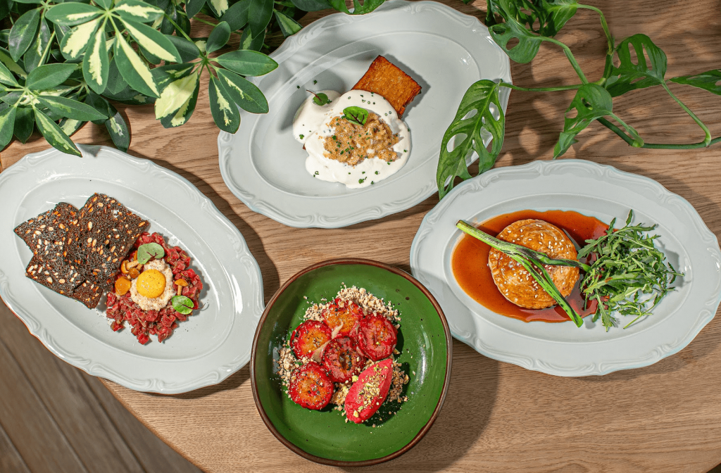Нас вдохновляли локальные продукты и французские техники приготовления: говяжий тартар из костреца мы посыпаем корнем свежего хрена прямо у стола и декорируем солеными опятами, а в качестве чипсов берём бородинский с семенами подсолнечника. Осенний урожай белых грибов добавил в мясной пирог «питивье». А на десерт запекли красные сливы с горячей халвой, подаем с мороженым.