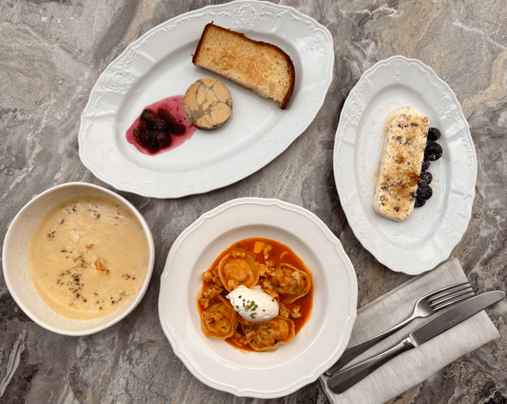 Французская кухня была неотъемлемой частью аристократической России. Наш сет-меню продолжает эту традицию, где французская классика сочетается с символом русской кухни – пельменями. Изысканное французское начало – нежный террин из фуа-гра. Затем крем-суп из лука-порея и картофеля, пельмени с сибасом и легкий десерт с ягодами.