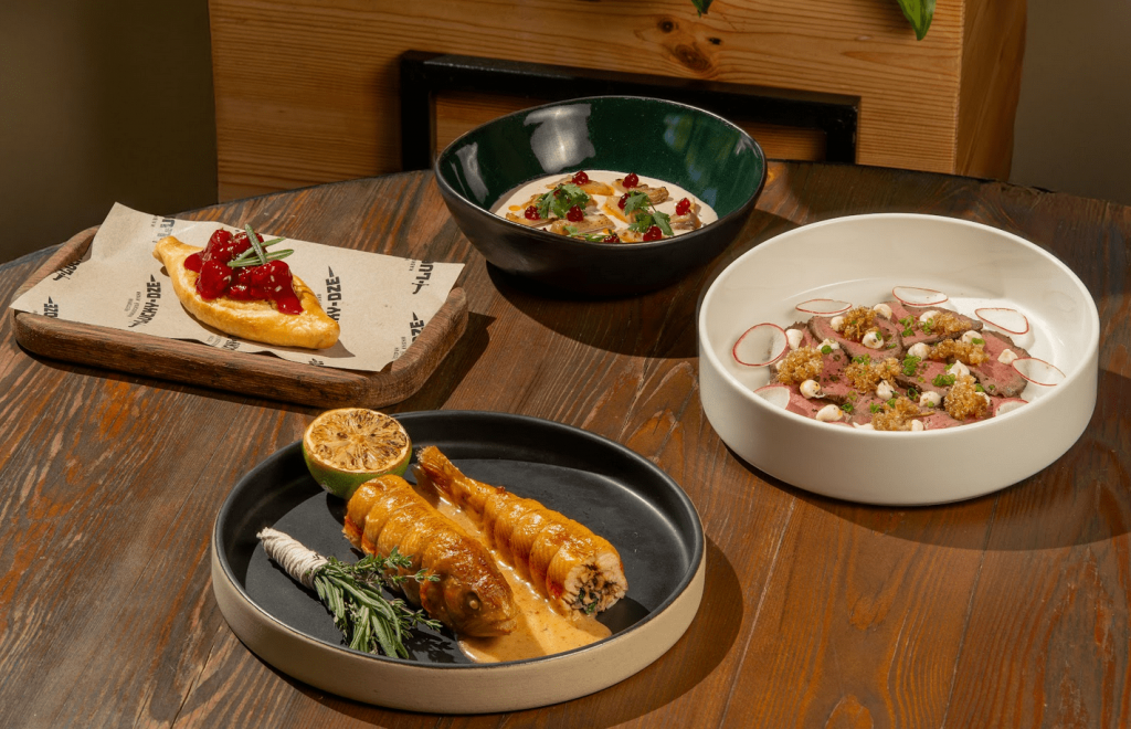 Создавая РРФ-сет за базу взял название фестиваля, как дань организаторам, и локальные продукты с кавказским акцентом: Р – Рапан, баже, гранатовый гель; Р – Ростбиф из мяса яка, джонджоли, крем из хрена; Ф – Форель, шпинат, томатное масло с аджикой. И в завершении фирменный десерт с клубникой: лодочка из песочного теста с миндальным кремом и свежей клубникой.