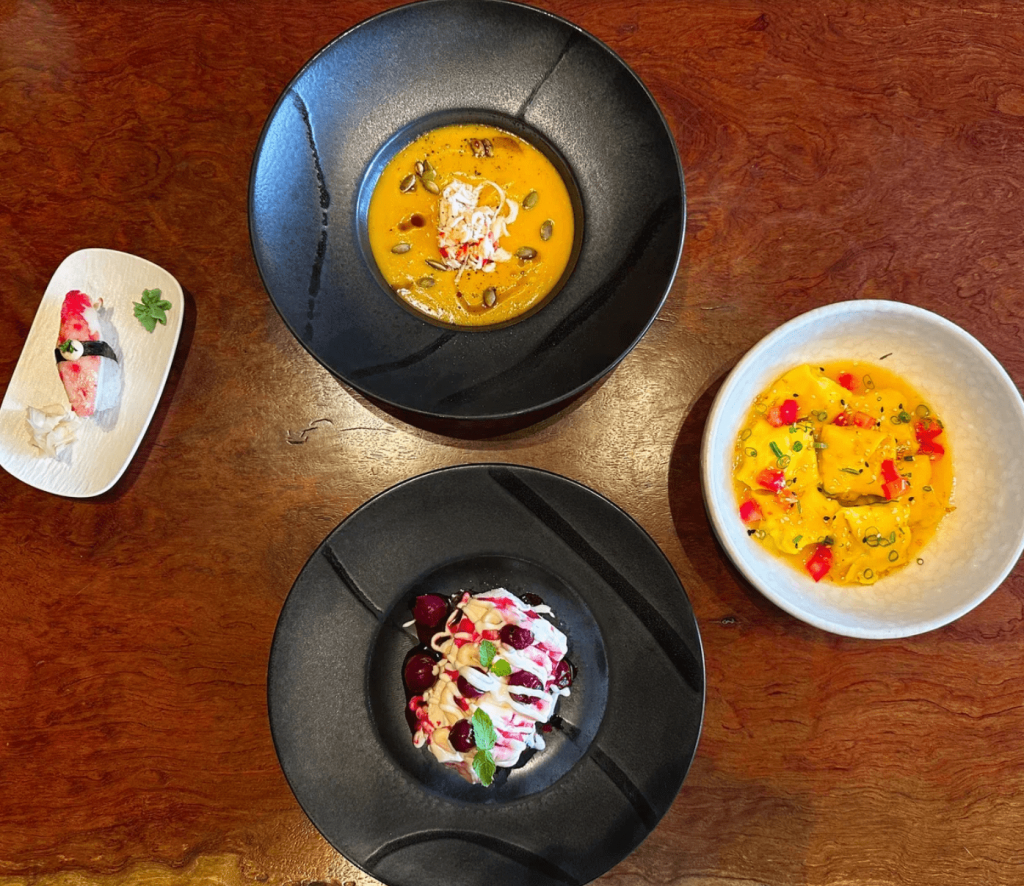 Наш сет показывает камчатского краба как жемчужину российской кухни – от сырой эстетики суси до уютного супа. Каждое блюдо подчёркивает универсальность этого деликатеса, уважая его природное происхождение и статус. Воздушный десерт завершает сет легкой нотой, напоминая о русской любви к контрастам: море → земля, соленое → сладкое.