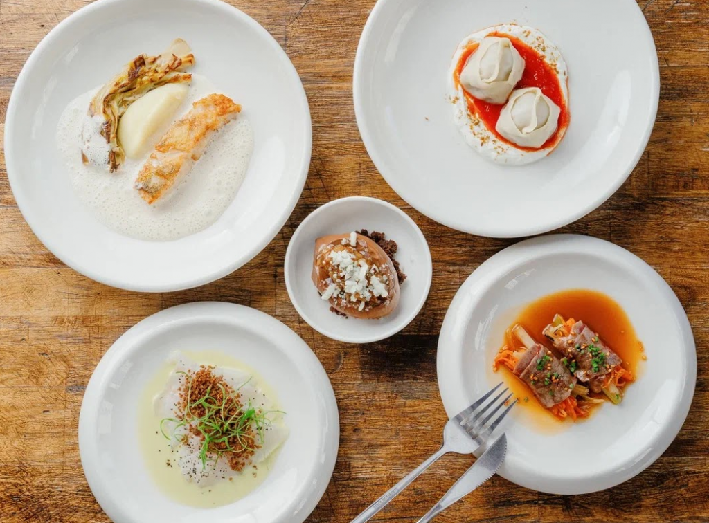 В меню используем локальные продукты, сочетая их с разными кухнями мира. Для сета я объединил блюда из разных уголков планеты: выдержанный стриплойн с овощами камчи, сугудай из муксуна с соусом на основе лайма и лука, манты с говяжьими хвостами, жареный судак с луком порей. Завершает сет крем из горького шоколада с горгонзолой.