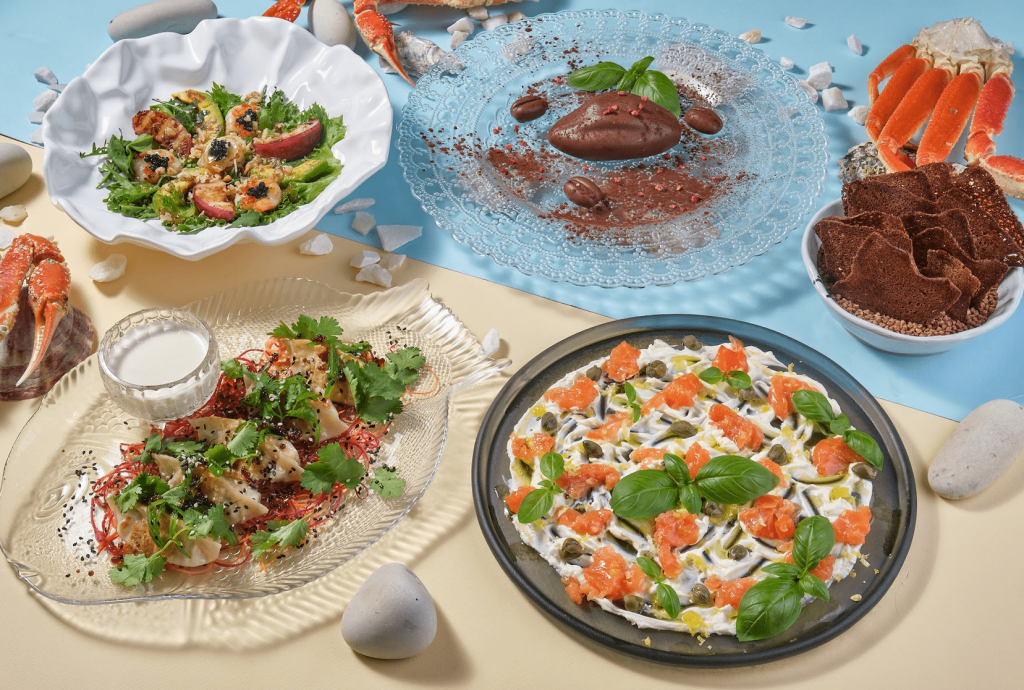 Сет SCUBA создан, чтобы пробудить воспоминания о самых теплых моментах. Цитрусовый лосось с сыром и каперсами, салат с креветками, гребешком и нектаринами, гедза с икорным соусом и десерт «Какао боб» дарят вкус дорогих сердцу моментов.