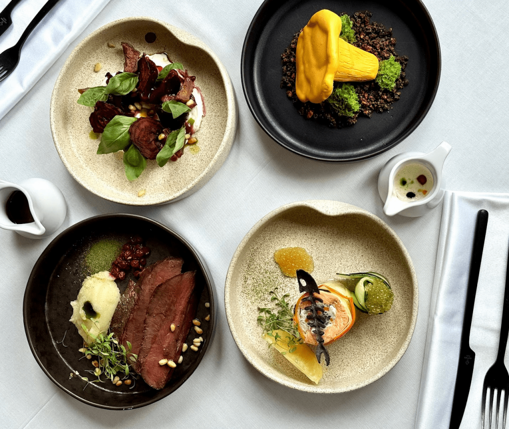Обратились к истокам: земле, лесу и воде. В первом курсе – блюдо из фермерских местных продуктов: подкопченная свекла с вишневым соусом и сырным муссом, вяленым инжиром и свекольными чипсами. Далее выбрали море и реку, где представлен двухслойный рулет из форели и судака с щучьей икрой. Затем отправились в тайгу: сердце оленя с кремом из сельдерея и яблок и соусом из таёжной брусники.