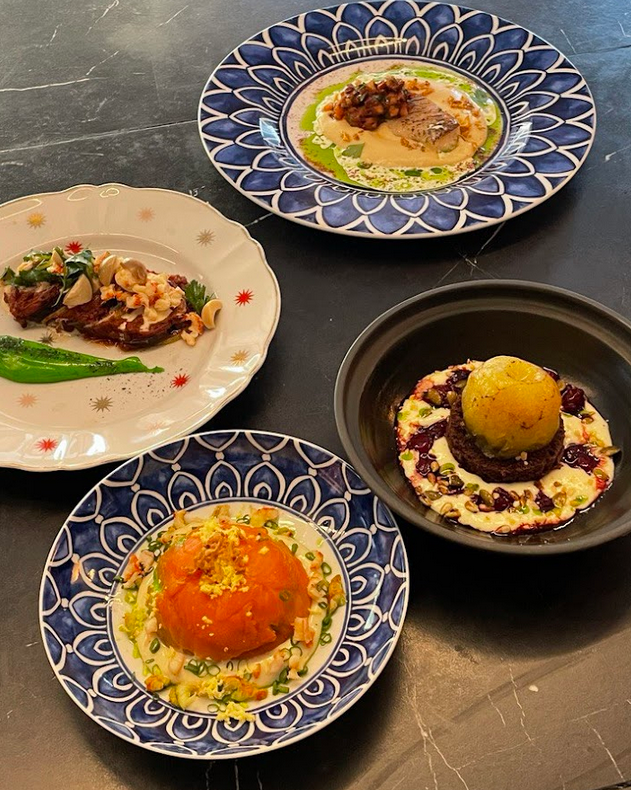 - Запечённые фермерские овощи с тартаром из раковых шеек и маринованными перепелиными яйцами