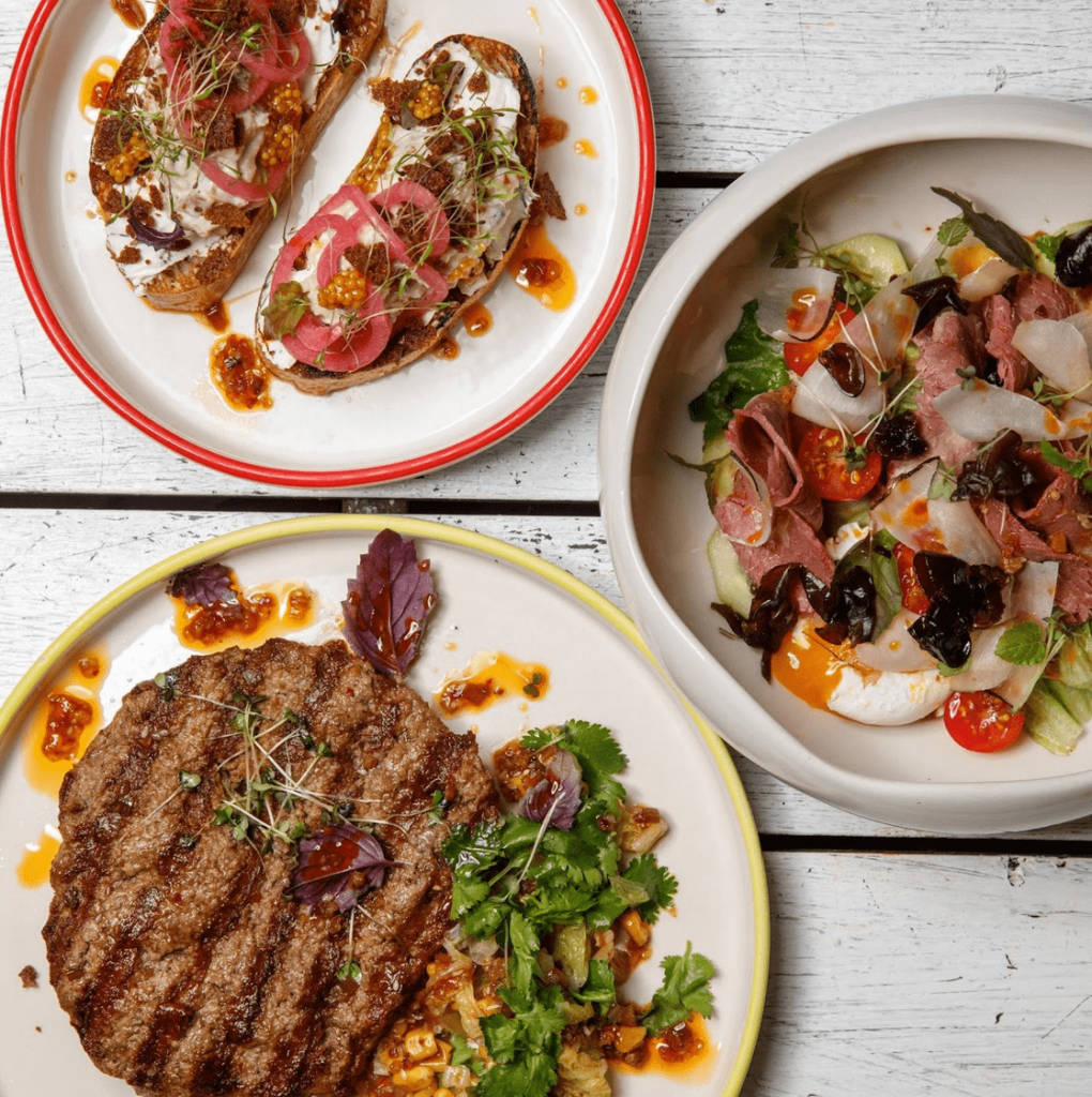 - Рубленая говяжья котлета, обжаренная на углях в хоспере, подается с маринованной пекинской капустой, кинзой и хрустящим маслом