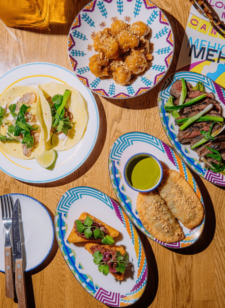 Получился достойный сет! Хрустящие пирожки эмпанадос, у которых внутри — настоящая душа блюда: нежная телятина, томившаяся с пряностями до состояния тающей текстуры. Мягкая лепешка тако, наполненная сочной утиной грудкой с хрустящей кожицей и освежающей ананасовой сальсой. Насыщенный вкус карне асадо и банан в темпуре с дольче лечче. Совершенство — в простоте.